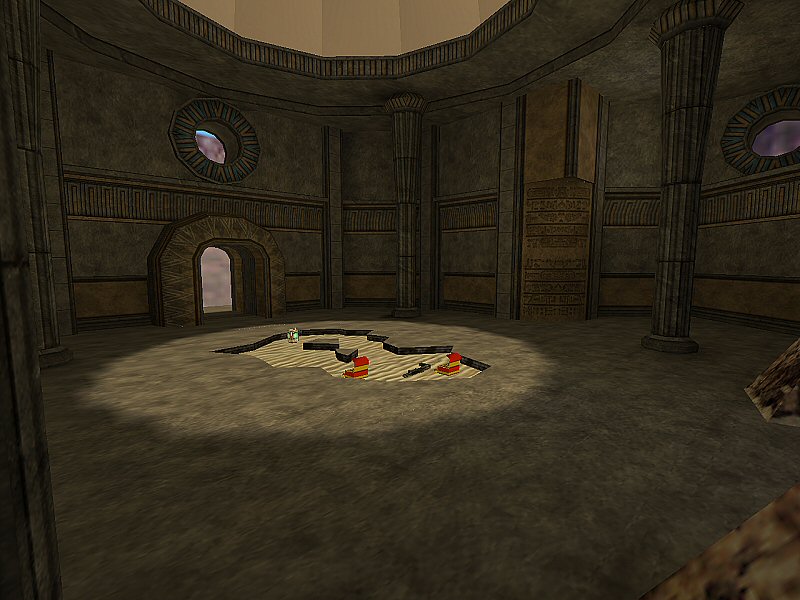 This is a map I was working on in mid-summer 2004. It was aimed to be a deathmatch map, but I never did finish the entire outdoors area yet. There isn't much to show, yet. The theme is egyption based. For the areas that aren't visible, there are tombs and other secrets around.