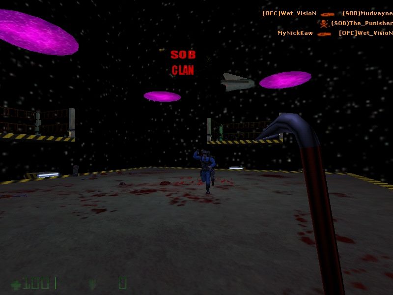 A very small map with 4 spawn points and each gets a crowbar type weapon,crowbar,knife,wrench,or grappling gun thing,has techno music, disco lights on main floor,alien birds flying and a space ship circling the arena,its in space and SOB logo floating above arena.