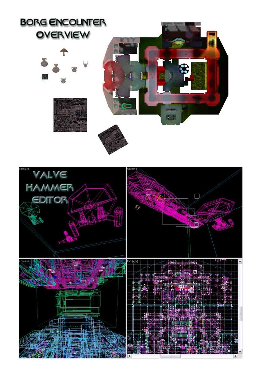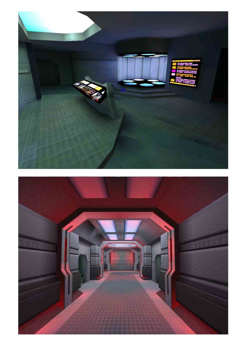 This map is in development still and is going to recieve a major rebuild due to R_speed issues and engine limitations. The original concept was going to be two ships both borg and fedreation that a player could teleport between amist a huge battle. Most likely it will end up being two separate levels. This level uses an awesome assortment of custom textures and wav files including trek background music.