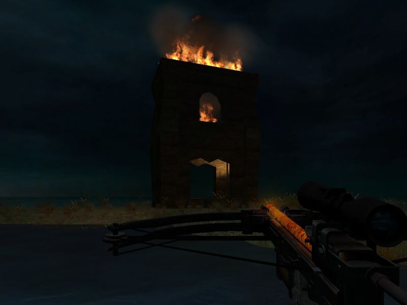 That third screenshot is a smaller tower... ON FIRE!! lol. I had never seen a building on fire in a DM map so i made one. It turned out to be damn cool. that is where the Crossbow is. You can see snipers silohuetted against the flames so they can't camp there too long without getting killed. What do you mean about flow and architecture? you probably mean that BIG FLAT perimiter wall don't you, because, yeah i need some help with that one...