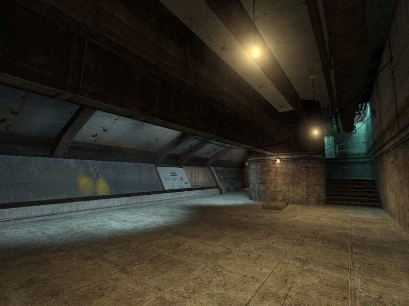 Attention to detail is great. Finger proves he's the master of lighting with some very atmospheric and dramatic lighting and shadowing. Harsher-than-usual contrasts between light and dark are great, and lights behind grates and fences and structures provide very cool shadows stretching across the floors and walls. Props are strewn realistically throughout the level, there are some cool design choices like weapons and powerups behind blocked-off areas that must be grabbed with the gravity gun, and all-around the map is pleasing to look at. Performance is great despite attention to detail.