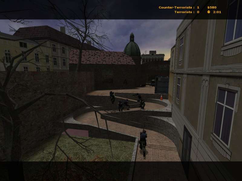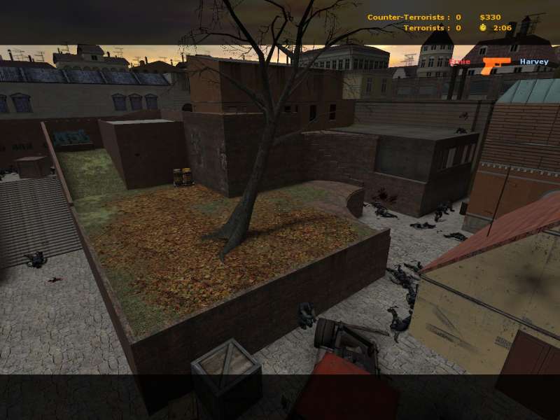 The terrorists spawn in a small square at the top of the map. The CTs spawn in and around a warehouse at the bottom of the map. One bombsite is right next to the CT spawn- very open and easier to cover. The other bombsite is by a church which the cts can rush to and cover quite effectively. The map is relatively small which can make for very intense firefights- but there are plenty of different routes, alcoves and hiding places to play in. There is also a passage through cellars/sewers which is very dark. Spawns for 64 players...