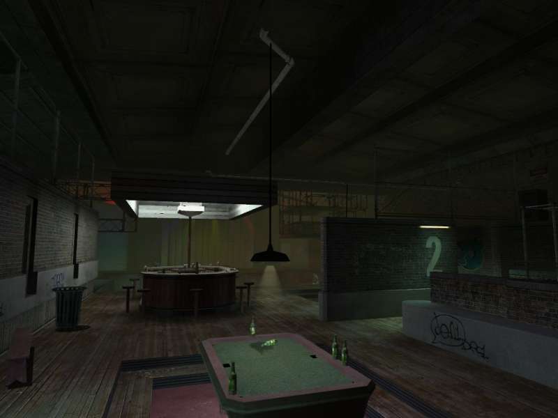 The map has an outdoor appearance to it (bricks, grafitti, etc.) because of the theme I picked. I was trying to incorporate an outdoor feel using outdoor objects and props, bricks, grafitti, apparatuses and other noticable things. The fog was added to appear as cigar/cigarette smoke in the bar.
