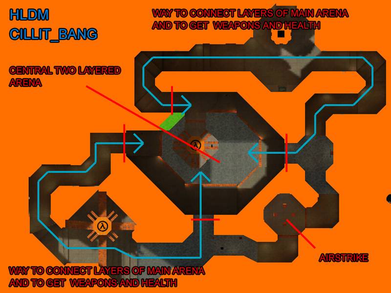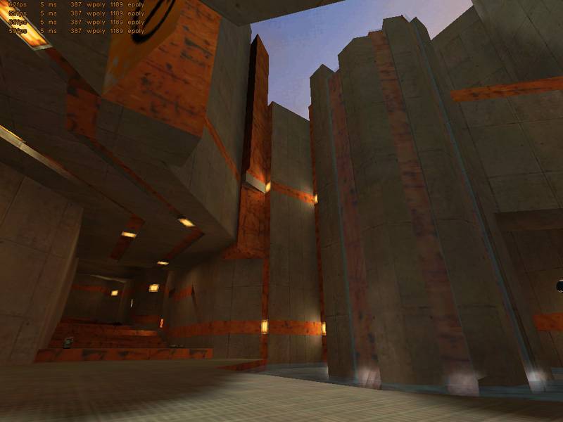 Map is designed after the "always walk" principle which means that there are no ending points.There is a main centered 2 layered arena, whose 2 stages are connected by 2 ways. Those 2 ways provide ammo, health and the strongest weapons, so they work as a rescue from the arena and a restock place.