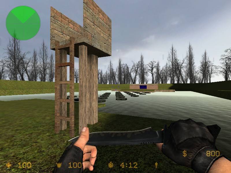 All players start in the same spot without weapons, to win the round you have to cross the river, pick a weapon and kill the rest.