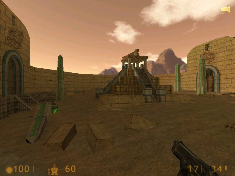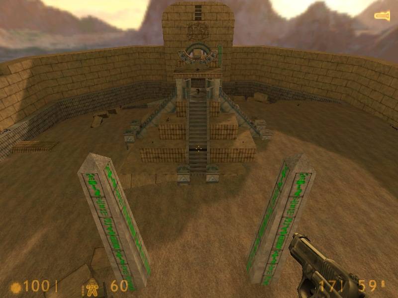 Warning/apology: As with my previous levels, I got a little carried away with the scope of Mausoleum and built a level which perhaps isn't well suited to the HL engine. In particular, r_speeds are quite high (approaching 3000 in some areas.) Consequently this level is a bit of a hog, and it won't play properly under HL's software display driver. It runs fine on a 2GHz Celeron with OpenGL. You have been warned!
