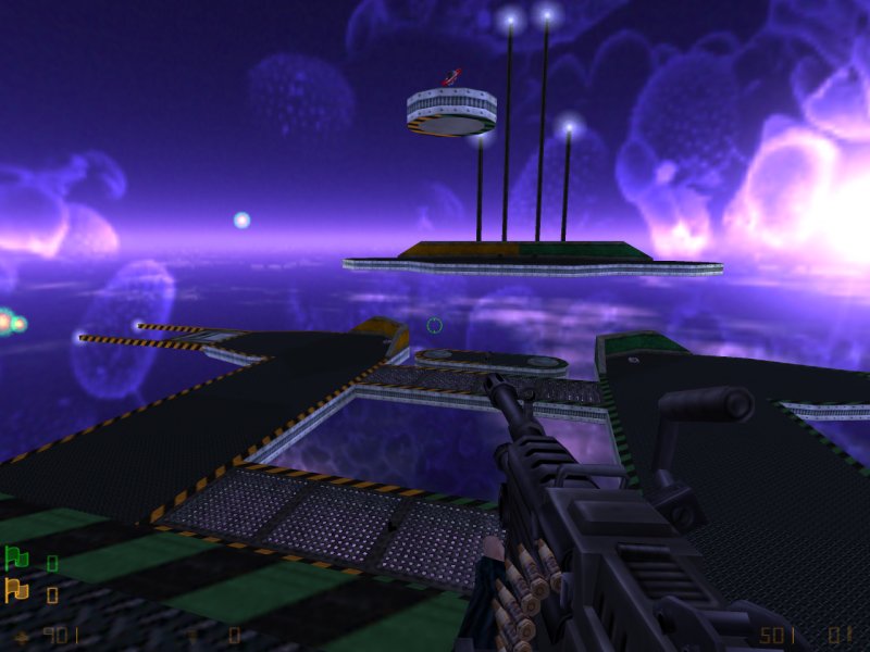 Although this is a perfectly balanced (team wise) map and ideal for home LANs due to the small size, it's just too hard to actually do any flag capping due to how you get around the map if you have more than a handful of people playing. The wormholes were good ideas, but maybe it might have been a better idea to have them as an aid to getting around the level, not the only way, and have the whole level in one single arena so some sniping etc. would be possible.