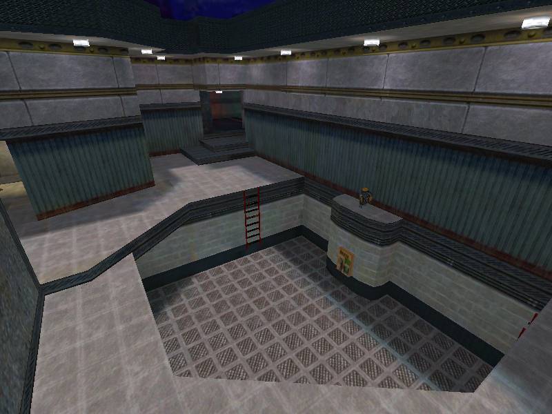 There's a nice new feature included in this map (well, I haven't seen it anywhere else anyway...). As well as your bog standard platforms, ladders and air vents, the author(s) have also come up with some kind of catapult. Stand on the paddle bit, and it will flick you up a level in a jiffy. It's quick and effortless, although they do tend to take a while to reset. Which may or may not be a bad thing. And if someone would care to tell me what the water pool thing with the very nice looking lambda symbol sticking out of it is, it would be appreciated (and probably forgotten :wink: