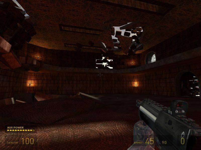 The arena is the inside of that small building, with holes in it large enough to see outside, and enough debris in the air to block half of what they throw at you. Plus all of those weird angles make for some interesting ar2 fights.