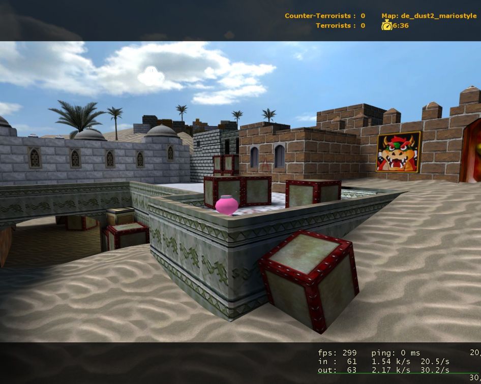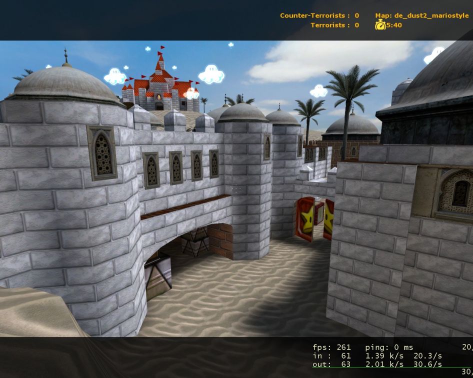 This is very creative. I like the star doors, and the king kupa on the wall. The textures all look very nice, and work real well with what you have. The new skybox is very well done.. I love the idea of the castle on the hill. That gives a real sense of emersion.. one thing you should of added pipes.. even if they went no where. How did you do the little glowing floating clouds? those are boss! I have not played the level yet, but I hope in it you added some Mario sounds too.. like at the start of the round the Mario song. That would be so awesome!