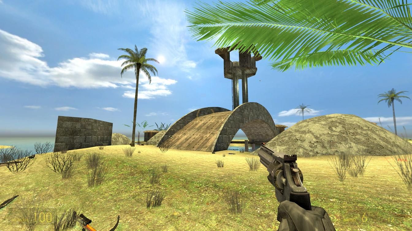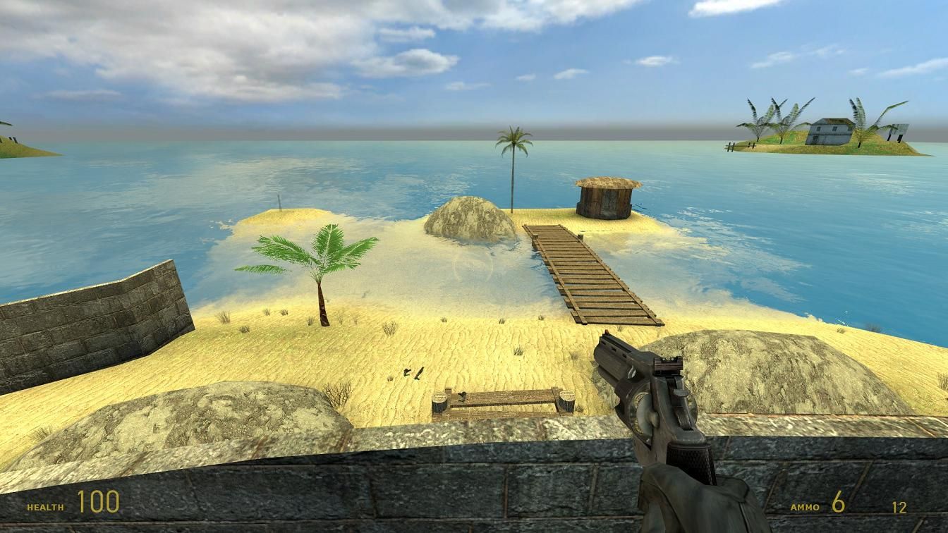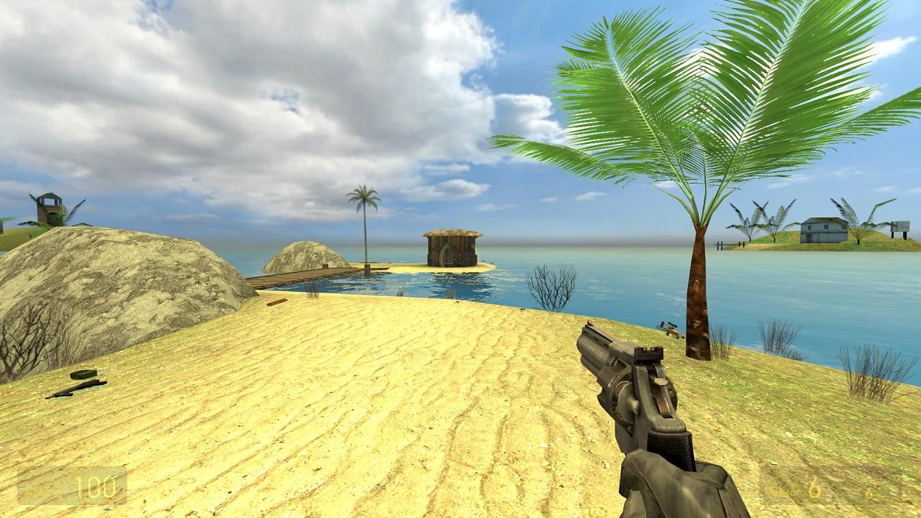 Tropical Island map in the ocean. Has one main island and a few small islands. Has a tropical look and feel, set during the daytime in the summer. The main Island has an upper and lower bridge. The upper main Island bridge has a higher lookout tower which can be climbed. All of the huts have ladders to climb onto the roofs.