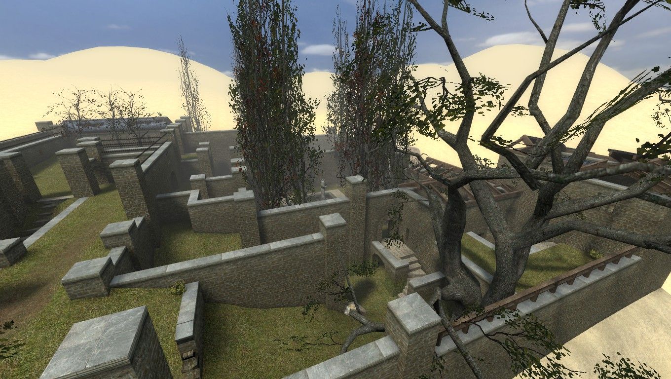 From the screenshots, it feels like a very minimalist-type map with subtle details, and the use of only a handful of textures, but after playing it, I've gotten a different opinion on the aesthetics, and think it's a very elegant map. It felt like a plausible place (except for the surrounding skybox area. I get the 'Eden' idea out of the desert. I'm guessing 'de_oasis' has been done to death?