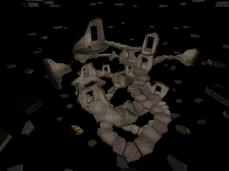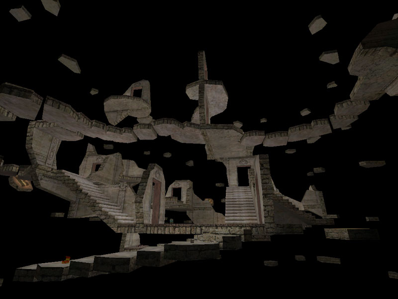 The setting is amongst the ruined pieces of an old building that have been blown from this reality into a parallel reality. They are suspended in a dark void and form the map. It is also surrounded by a spinning debri field, giving the impression of being in the middle of a vortex.