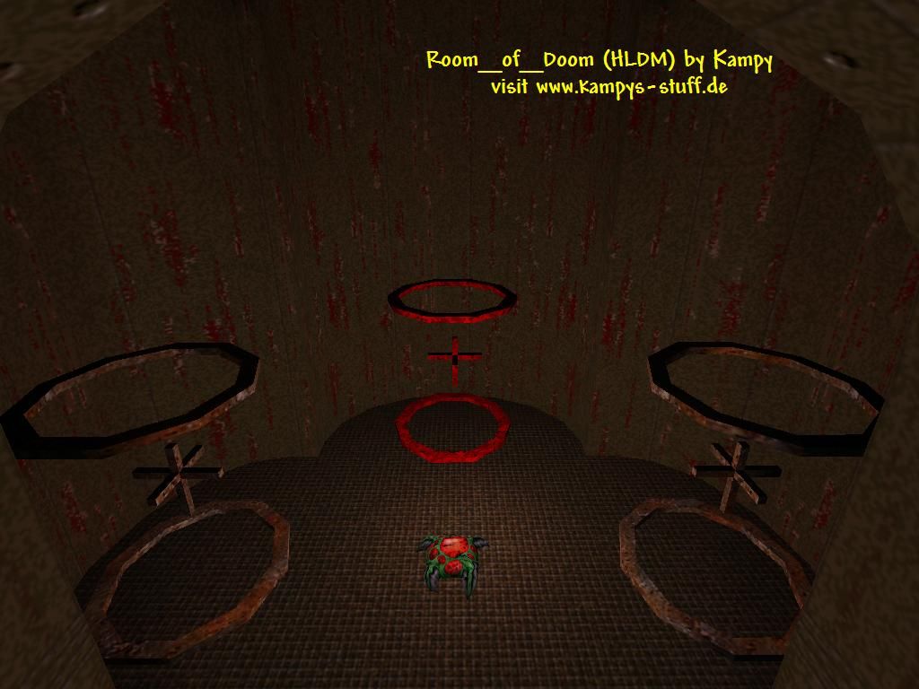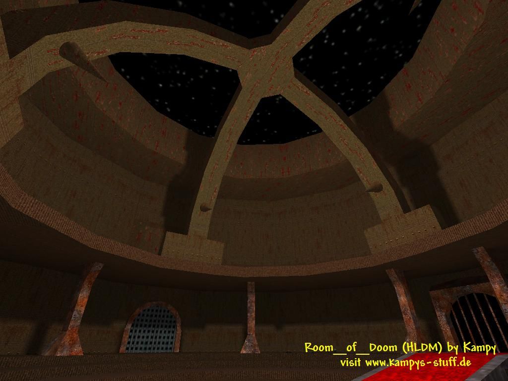 This is an arena type map with a quake or doom look. It had been a map of the "Operation A.M.O.K." mod which was canceled some time ago. I took the 85% ready map and completed it for Half-Life Deathmatch now. The architecture of the map is very complicated. The whole map is round and doesnt have a straight floor which was very hard to build with the HL engine. The R_speeds are a little high because of that ( 900). The gameplay is typical arena gameplay, you start grab a weapon and shoot into the middle of the arena. This is great fun and there's another cool feature of the map: at one side of the arena there's a wooden cross which you can turn around by using it. This causes a great explosion which kills everybody on the whole map. The only way to survive this explosion is to step into one of the teleporters and beam on the top of the arena. Then you have to crouch in the middle of it so you wont be caught by the explosion. Basically Room_of_Doom is one big cylinder room with 2 floors and a small position at the top of it. To get into the second floor you have to go through a small corridor where you can find some goodies. The teleporters are on the second floor. Both teleport you into the main teleporter room where you can choose if you want to go on the top of the arena or in the middle of it at the bottom. The itemplacement is like this: there are machine guns and shotguns next to each other placed at the starting points inside the arena hall. In the middle at the bottom there is the crossbow and in the corridor you find Colts, health, a battery and the longjump. Find ammunition in the teleporter room and the bazooka at the top of the arena. All weapons are regulary used in room_of_doom. Its a good choice to hide at the first floor with the crossbow, but if you do you are likely to die when someone turns the cross. All in all a cool arena map with lots of different weapons used and great for arena deathmatch or adrenaline gamers.