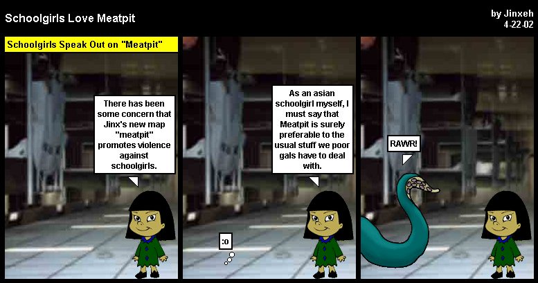 "Meatpit" is a spoof of "killbox" style maps. Basically it's a silly arena map meant for play on a LAN or with a few friends. Includes some nice custom textures by Alice (wad available on my site).