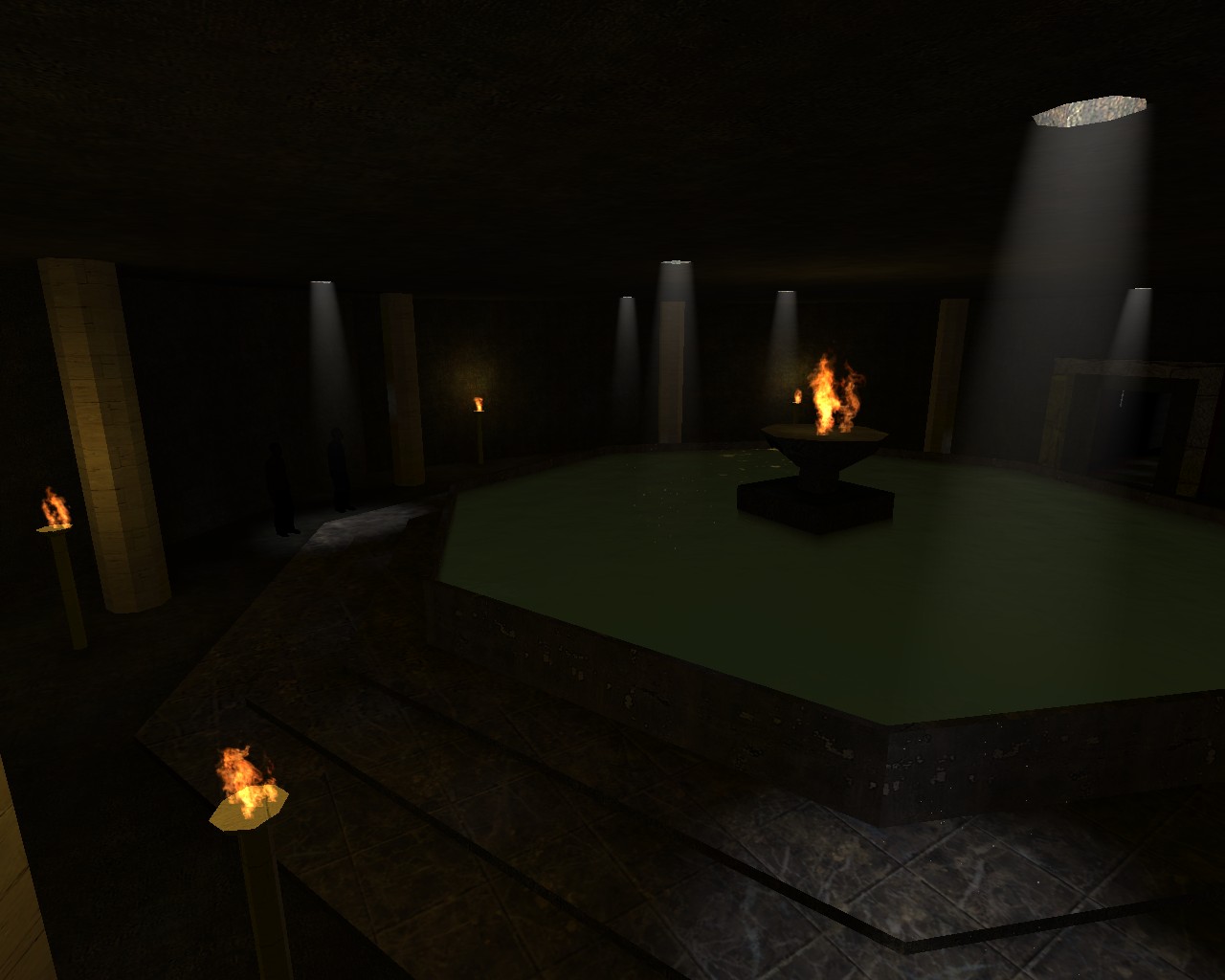 We tried to create a very balanced map that is fun to play using elements that strongly dominate the gameplay, i.e. the water and the bridge, the hallway and the underpass with the crossing line trough the temple.