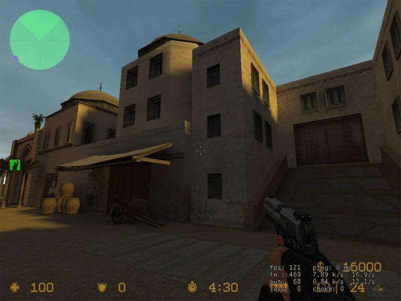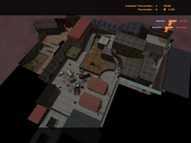The terrorists spawn in a small square at the top of the map. The CTs spawn in and around a warehouse at the bottom of the map. One bombsite is right next to the CT spawn- very open and easier to cover. The other bombsite is by a church which the cts can rush to and cover quite effectively. The map is relatively small which can make for very intense firefights- but there are plenty of different routes, alcoves and hiding places to play in. There is also a passage through cellars/sewers which is very dark. Spawns for 64 players...