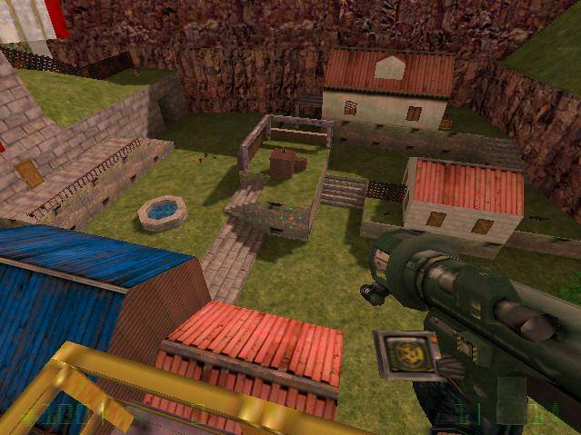 A close reproduction of Kakariko Villiage from Zelda: Ocarina of Time. Considering that it was designed as a peaceful hamlet, it lends itself very well to combat. I spent a lot of time finding a weapons balance I thought was fair. The roofs are close enough to long-jump between and two of the buildings can be entered for health. The bottom of the well slowly recharges health, but one can be trapped down there temporarily if someone else drains the water by touching the windmill door. It also comes with background music, which can be turned on and off in the potion shop, either because of personal preference or to sync it up on nearby computers during LAN play. This map is good in Half-Life, but better in Op4!