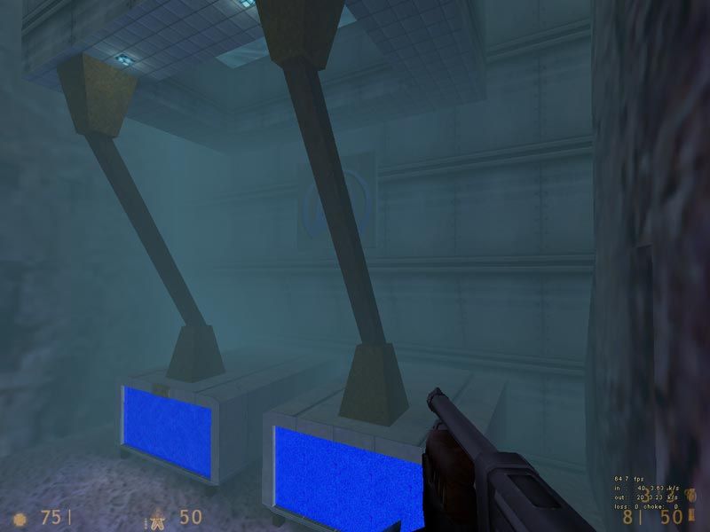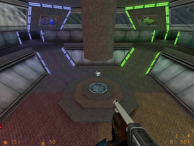 Also, much of the level is under water--at least all of the outdoor space between bases is. So you don't drown like a pathetic wretch, I've added some Air Suits. Ok, they look (and sound) like HEV suits, but they give you air, and that's all that's important. They'll give you 30 seconds of extra air, and are available from the bottom and middle team base exits, as well as the Neutral base exit. The suits in the team bases are usable by anyone, while the suits in the middle base are available for the team that owns the Command Point. Oh, and be nice, leave suits for the rest of your team.