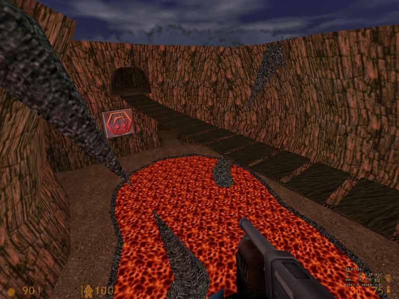 This is a standard CTF style map. There are two bases in the map, all set in a volcano named Erebus textured in almost all quake textures. There are various pools of lava around, so try not to step in it because it will kill you. Normal dropped flags return after 60 seconds, but flags dropped in lava return in about 8 seconds. Bring the enemy flag to your flag to capture it.