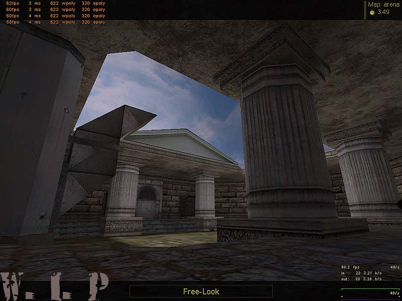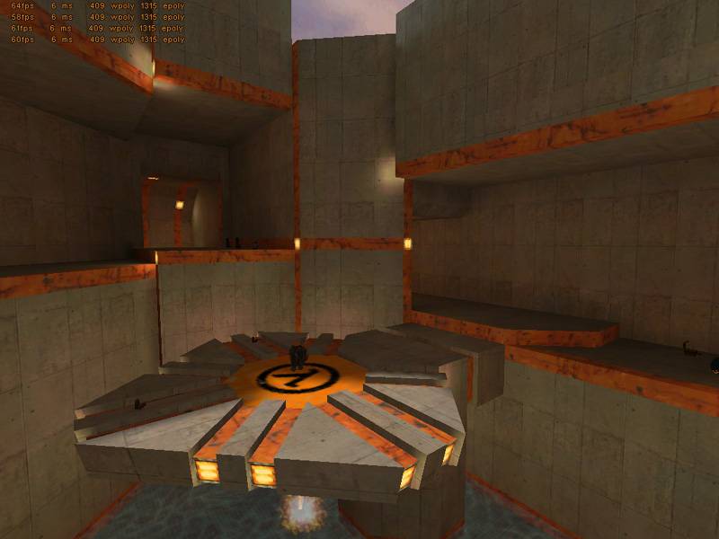 Map is designed after the "always walk" principle which means that there are no ending points.There is a main centered 2 layered arena, whose 2 stages are connected by 2 ways. Those 2 ways provide ammo, health and the strongest weapons, so they work as a rescue from the arena and a restock place.